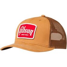 Trucker cap, brown canvas, adjustable adult size, breathable mesh, classic Gibson style