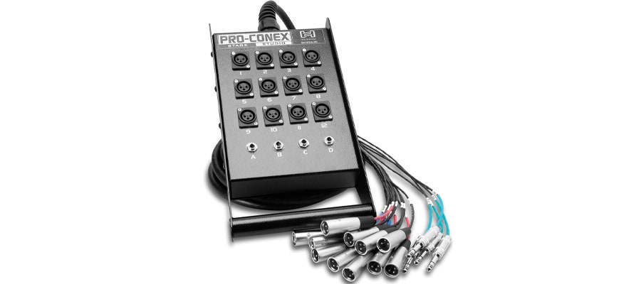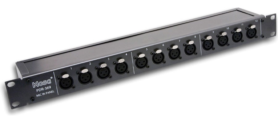 12-kanavainen patchbay, balansoidut XLR-liittimet, naaras edessä ja uros takana (konfiguroitavissa).