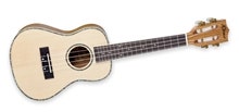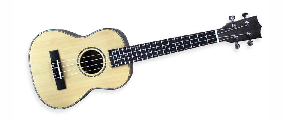 Grand Concert ukulele käsinojalla, sekä soololovella. Täyspuinen kuusikansi, Caidie-pohja ja -sivut.
