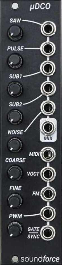 SoundForce uDCO on Juno-tyylinen 6HP Eurorack-oskillaattori, jossa on 5 äänilähdettä, MIDI-ohjaus, hard sync...