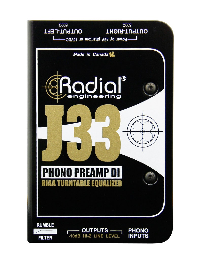 J33™ yhdistää korkealaatuisen levysoittimen (phono) esivahvistimen ja DI-boksin, tarjoten sekä kuluttajatason linjalähdöt että balansoituja mikrofonitasoisia lähtöjä. Näiden avulla levysoitin voidaan liittää suoraan ammattitason äänentoistolaitteisiin, kuten miksauspöytiin ja äänikortteihin.