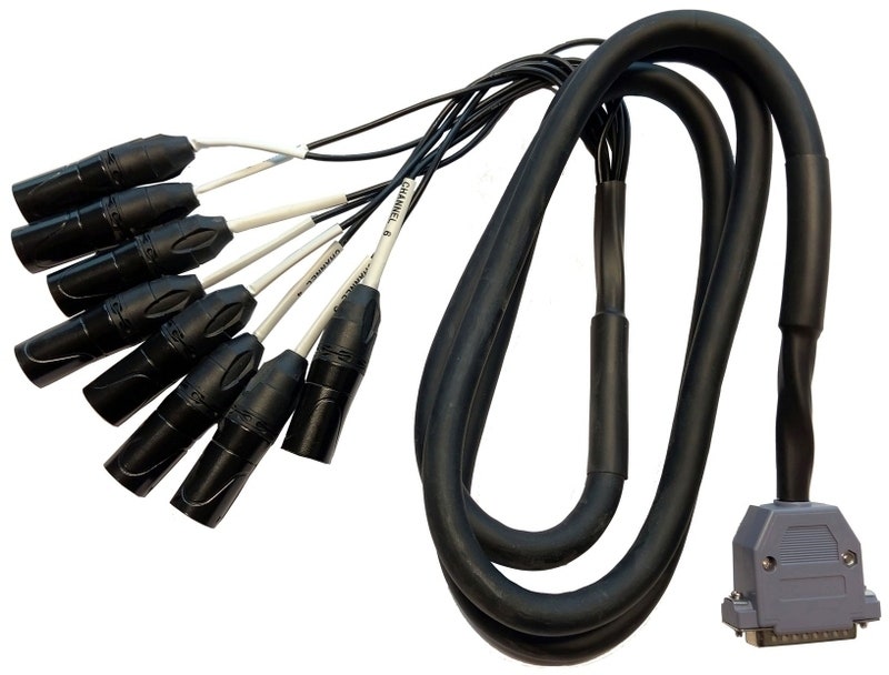 Laadukas multikaapeli, jossa on kahdeksan metallista ja balansoitua XLR-urosliitintä vedonpoistolla ja 25-napainen D-sub-urosliitin.