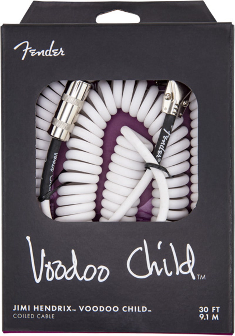 Fender Hendrix Voodoo Child -kierremallinen instrumenttikaapeli 9.1 m, White: vintage Pancake -kulmaplugi ja jumbo-suora liitin, 6.5 mm PVC-vaippa, 95 % kuparisuojaus ja OFC-punos — vähäkohinainen, luotettava ja näyttävä lavalle ja studioon.