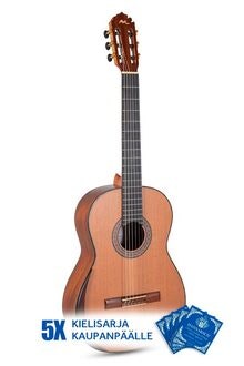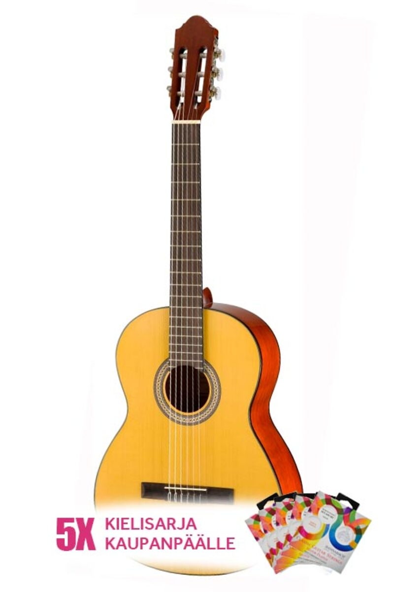 Tuotenumero 1093056Klassinen kitara kokopuisella kuusikannella. Kaupanpäälle 5 settiä Hannabach kieliä!