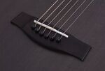 The guitar features a set-neck construction with a mahogany neck and rosewood fingerboard. The 25.5” scale length and 20 medium frets provide familiar acoustic playability, while the ebony-style multi-ply rosewood binding enhances the instrument’s visual character.