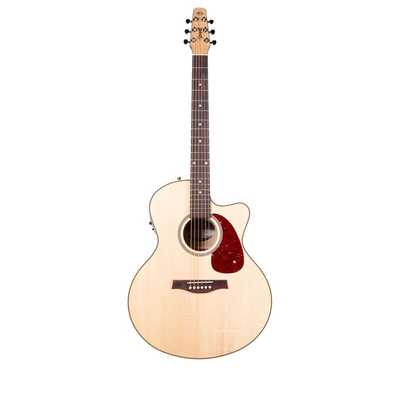 The Seagull Performer CW Mini-Jumbo features a pressure-tested solid spruce top with flame maple back and sides, producing a bright, resonant tone with strong midrange presence. The Mini-Jumbo shape combines a wide lower bout with a slimmer waist for a balanced tonal response.