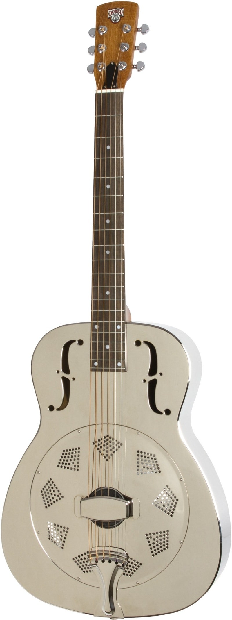 Ulkonäkö: Perinteinen pyöristetty Dobro-lapamalli ja 4-värinen vintage-tyylinen Dobro®-siirtokuva harppu-logolla