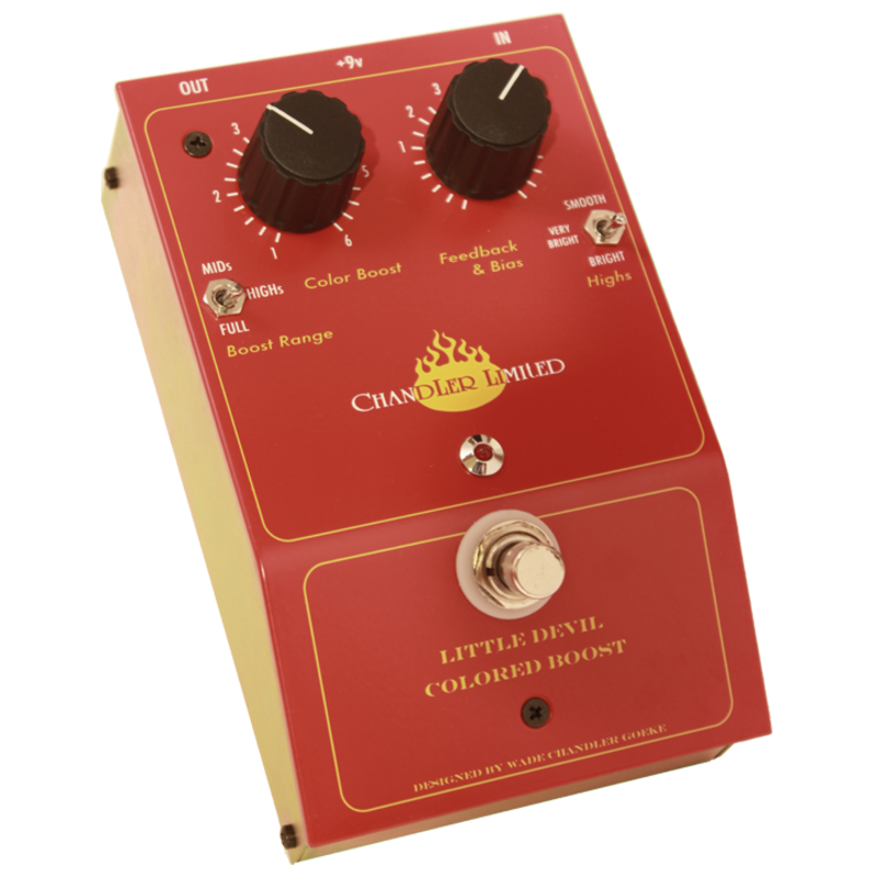 Wade Goeke of Chandler Limited called this pedal a Colored Boost for a reason! It’s not a clean boost, but it’s not a fuzz either. The Chandler Little Devil Colored Boost can gently color your Fender or drive your old Marshall into oblivion. The soul of the Colored Boost is the Class A amplifier design and the selectable Feedback/Bias control. The six presets range from slightly fuzzy to an “in your face” Plexi sound. Each preset has its own style of harmonic distortion and clipping, with different effects on a sine wave signal. Soft clipping; hard clipping; clipping on the top, bottom or both sides of a sine wave; and significant changes in frequency happen with each click of the Feedback/Bias switch. Capable of 39db of boost, the Colored Boost can easily range from gentle sustain to screaming vintage.