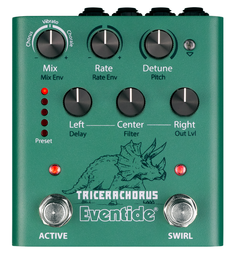 Inspired by the classic Tri-choruses and stompbox choruses of the 1970s and early 1980s, the TriceraChorus pedal pairs rich Bucket Brigade-style chorusing with Eventide’s legendary MicroPitch detuning for a lushness that rivals the jungles of the late Cretaceous Period. TriceraChorus features three chorus voices and three unique chorus effects which can be used to create a wide stereo spread with pulsing waves of modulation. The innovative “Swirl” footswitch adds psychedelic flanging, phasing and Univibe-style tones. It has never been easier to dial in syrupy smooth deep modulation on guitar, bass, synths, strings, vocals and more.
