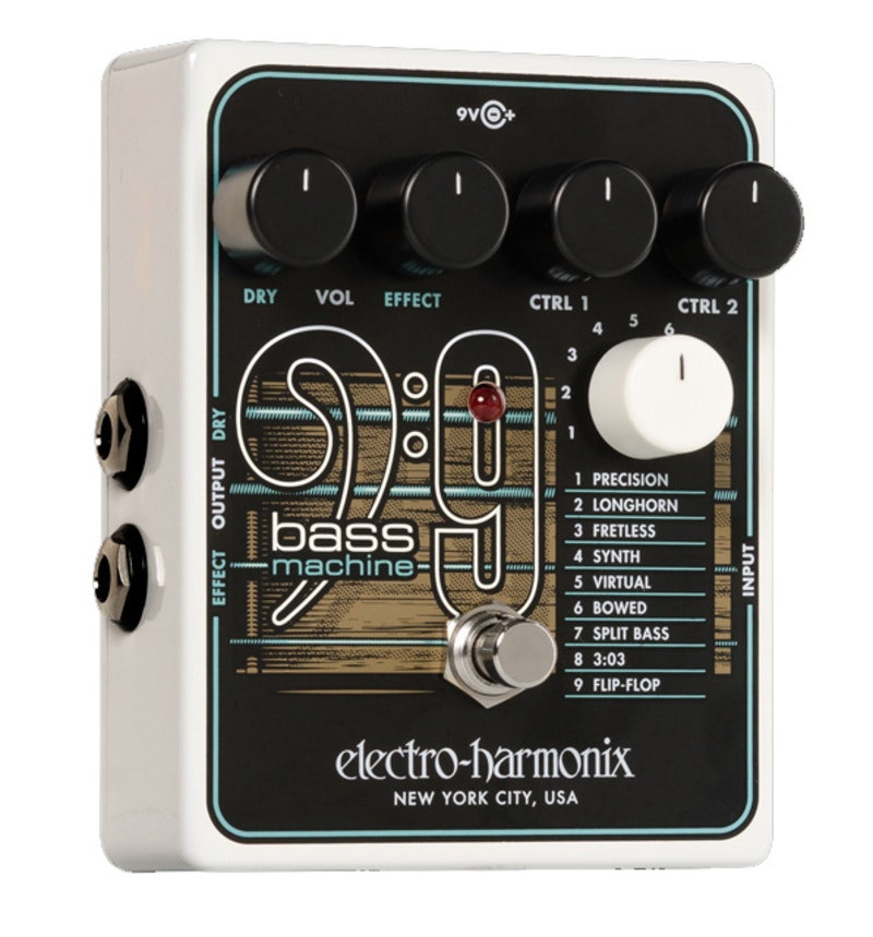 Polyfoninen BASS9 Bass Machine muuntaa kitarasi yhdeksäksi erilaiseksi bassoksi ilman, että erillisiä mikrofoneja, MIDI-laitteita tai soittimesi modifiointia. Se käyttää samaa teknologiaa kuin kaikki EHX9 Series -pedaalit (esim. palkittu MEL9® Tape Replay Machine), mutta siinä on uusi algoritmi, joka on optimoitu siirtämään sävelkorkeutta yhdestä kahteen oktaavia alaspäin, tarjoten erinomaiset dynaamiset ominaisuudet ja nuotin seurannan.