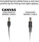 Each model is available as a standalone power supply or as a linked set with another Canvas power supply via the 24V power adapter. The thin design means that Canva's power supply can fit under all pedalboards. Thanks to the built-in LED power meter, you can clearly see how much power is left, and each output has its own LED indicator that shows when power is being used. You will also find specially designed 2.1mm barrel cables in the package, specially designed with a 90 degree connector on one end and a super short straight connector on the other. The Canvas Power 5 has 5 isolated current outputs that provide up to 500 mA of "clean" current at 9V. One of the outputs has variable voltage, allowing you to switch between 9V, 12V and 18V to drive high voltage pedals.
