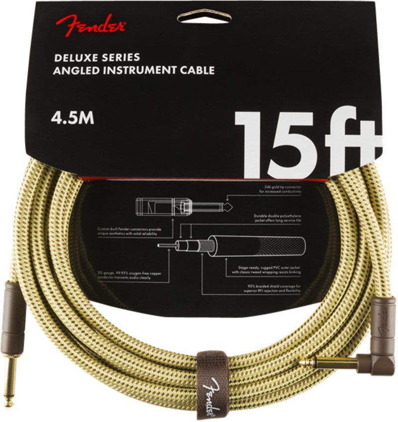 Fender Deluxe Series cables carry the highest quality materials and braided shielding to deliver flagship durability, conductance and transparency. Our top-of-the-line cables sport custom molded ends with strain relief under the housing—plus 24K gold-plated connectors that won’t tarnish or degrade your sound over time. These cables use a very quiet braided shielding that is engineered to maximize the purity of your tone, and they’re protected by a soft-woven yet rugged tweed jacket that provides ultimate protection with classic Fender style.