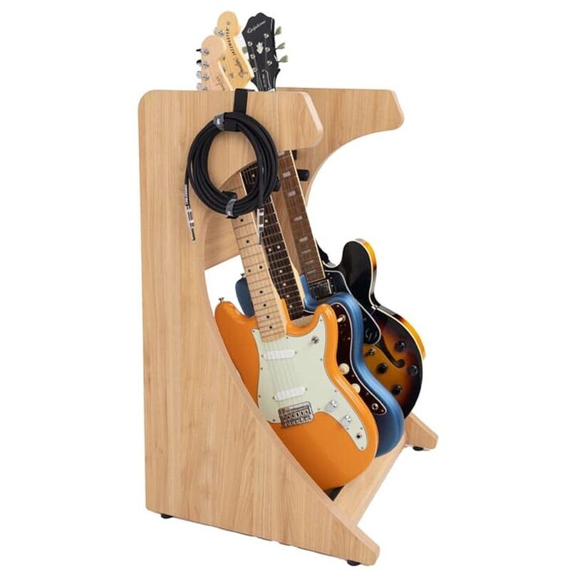 Adjustable divider pegs with rubberized coating keep each instrument separated and protected, while the soft padded base prevents guitars from touching the wood. Built from 25 mm laminated plywood with a textured wood-grain surface, this rack ensures stability. Non-slip rubber feet protect floors, and cable hangers on both sides add practical storage.