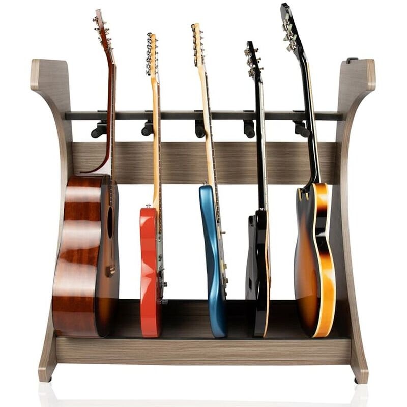 The Gator Frameworks Elite 5 E/A Guitar Rack Gray holds up to five electric or acoustic guitars—or 5–7 cases—making it ideal for studios, showrooms, classrooms, or home setups. It offers safe and organized storage for a wide range of instruments.