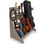 Adjustable divider pegs with a rubberized coating keep guitars and cases safely separated, while the soft-padded base prevents contact with the wood surface. The non-slip rubber feet protect floors, and cable hanger hooks on both sides add convenience. Constructed from 25 mm laminated plywood with a gray textured wood-grain finish.