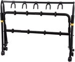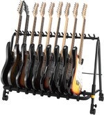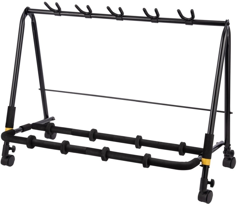 Tuotenumero 1082773Kokoontaitettava ja pyörillä varustettu kitarateline viidelle sähkökitaralle, bassolle tai akustiselle kitaralle.