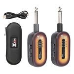 The transmitter connects directly to an instrument or effects pedal, while the receiver connects to an amplifier, amp modeler, or pedalboard. Two systems can also be used simultaneously — for example, one between the instrument and effects, and another between effects and amplifier.