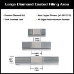 Meidän matalan profiilin kahva antaa sinun päästä lähelle otelautaa ja viilata mukavasti ja hallitusti mihin tahansa suuntaan tilanteen mukaan. Yläpuolella olevat urat ja sivuilla olevat nuolet osoittavat timanttiverhotun hiontavyöhykkeen paikan.