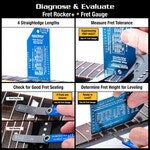 Diagnoosi Fret Rocker+ ja Fret Gauge -työkaluilla. Tarkista nauhan taso 3 U-Viilallamme, jotka hiovat yksittäisiä korkeita nauhoja, jotka aiheuttavat ei-toivottuja nauhaääniä. Kruunaa uudella vallankumouksellisella Diamond Coated Fret Crowning S-File -työkalulla.