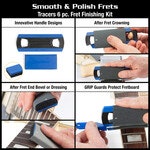 Korjaa nauhan nousu Fret Beveling B-File -työkalulla, jossa on täydelliset kulmat 3° ja 23°, ja ergonomisesti kaareva, säteellä varustettu kahva tuo täydellistä mukavuutta ja hallintaa. 2 'n 1 säädettävä viila antaa sinulle sekä yksittäisen että kaksoishionnan. Diamond Coated Fret End Dressing E-File -työkalussa on kaksi turvallista reunaa (lievä säde, litteä), ergonominen kahva ja premium-timantit terävien nauhanpäiden korjaamiseen. Viimeinen silaus on tarjolla kaikilla nauhan viimeistelytuotteilla, jotka tasoittavat ja kiillottavat nauhat. 3 suojalistaa suojaavat otelautaa käytettäessä 6-osaista Tracers Polishing System -sarjaa.