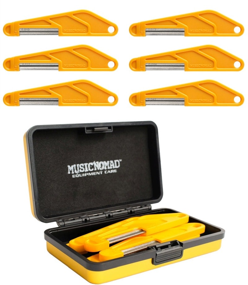 MusicNomadin patenttia odottavat satulatyökalut tarjoavat vallankumouksellisen timanttipinnoitteen ja pyöreän "kielen muotoisen" teräsuunnittelun, joka takaa sileät ja tarkat leikkaukset. Ne leikkaavat ja kiillottavat urat samanaikaisesti, eivätkä seilaa uralta kuten tavalliset hammasviilat. Teollinen, tasainen timanttipinnoite leikkaa ja kiillottaa kaikki yleisimmät satulamateriaalit, kuten nailon, luu, grafiitti ja TUSQ. Ne toimivat uskomattoman hyvin myös tallapaloissa. Lisäsimme ergonomisen kahvan täydelliseen mukavuuteen ja hallintaan leikkuun aikana, tai voit poistaa terän kahvasta vaihtoehtoisena työstövaihtoehtona. Tämä räätälöity setti sisältää 6 viilaa sähkökitaraa varten – kevyille kielille. Mukana tulee myös kompakti ja kestävä alumiinikotelo. Tämä on MusicNomadin laatua – nostamassa rimaa soittimen huollossa.