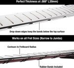 Ei ole mitään parempaa kuin mielenrauha samalla kun säästät aikaa ja rahaa. MusicNomadin patenttihakemuksessa oleva Fret Shield asettaa uuden, korkeamman standardin täydelliselle otelaudan suojaukselle nauhatyöskentelyn aikana, kuten kiillottamisessa, tasoittamisessa ja kruunauksessa. Sano "EI" siniselle teipille uudelleenkäytettävällä suunnittelullamme, joka menee paikoilleen sekunneissa, suojaa täydellisesti vahingoittamatta otelautaa ja kestää satoja nauhatöitä. Korkealaatuinen ruostumaton teräs on täydellisellä paksuudella (.008" / .20mm), valmistettu tarkkuusprosessilla ja kaikki reunat ovat sileitä ja pyöreitä. Innovatiivisesti muotoillut reunat mahdollistavat sisällytettyjen kumilenkkien pitävän Fret Shieldin paikoillaan turvallisesti ja pitävät nauhat pinnan alla estäen niiden vahingoittumisen kiillotusprosessin aikana. Fret Shieldsit tulevat suosituimmissa skaalakoissa ja sisältävät kätevän ripustusholkin. Olipa otelautasi viimeistelty vaahtera tai viimeistelemätön ruusupuu otelautamerkeillä, otelautasi kiittää sinua sen suojaamisesta. Se on MusicNomad-laatua – nostaa rimaa välineiden huollossa.