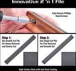 Täysin säädettävä 6" (15 cm) viila, jossa on 2-in-1-muotoilu, mahdollistaa helpon vaihtamisen viilauksen viimeistelyn, viistekulman ja viilan vaihdon välillä. Yksi viilan puoli on kaksoisleikkuupinta, joka poistaa materiaalia nopeasti ja karkeasti, kun taas toinen puoli on yksittäisleikkuupinta, joka mahdollistaa hienomman poiston ja sileän viimeistelyn. Täydellinen yhdistelmä kaikille nauhamateriaaleille, mukaan lukien nikkeli, EVO-kulta ja ruostumaton teräs, valmistaen nauhat seuraavaan vaiheeseen – viimeistelyyn ja kiillotukseen.