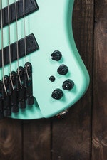 The neck is constructed from five-ply roasted maple and walnut with graphite reinforcement rods for added stability. The scale length is 889 mm (35") on the low string and 838 mm (33") on the high string. The fingerboard is made of roasted maple with birdseye figure and features abalone offset dot inlays at the 12th and 24th frets. The frets are medium stainless steel.