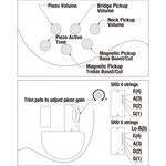 The bass is equipped with Nordstrand Big Break pickups at the neck and bridge. The bridge features a custom AeroSilk Piezo system designed to emulate the sound of an upright bass. Controls include an active 2-band preamp and an active tone control for the Piezo pickup.