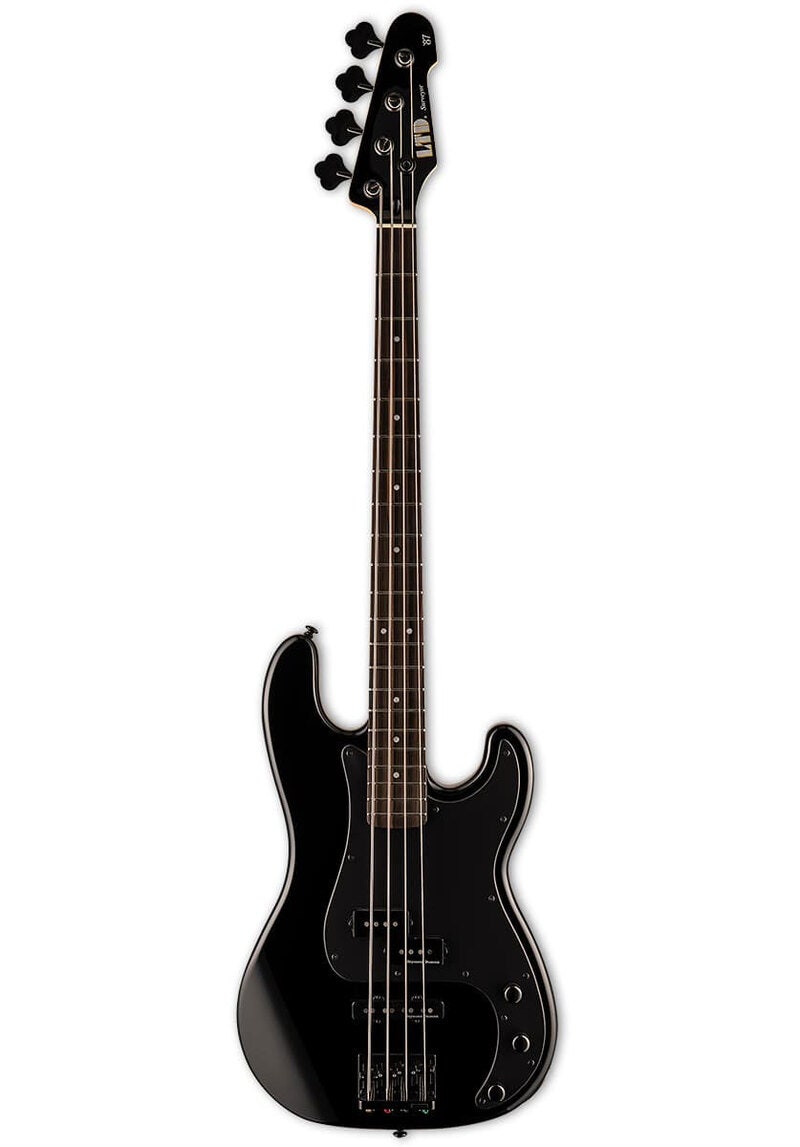 LTD Surveyor ’87 Black on klassinen 80-luvun henkinen sähköbasso, jossa on leppä-runko, Seymour Duncan Vintage P/J -mikrofonit ja Gotoh 201B-45 -talla monipuoliseen, täsmälliseen ja dynaamiseen soittoon.