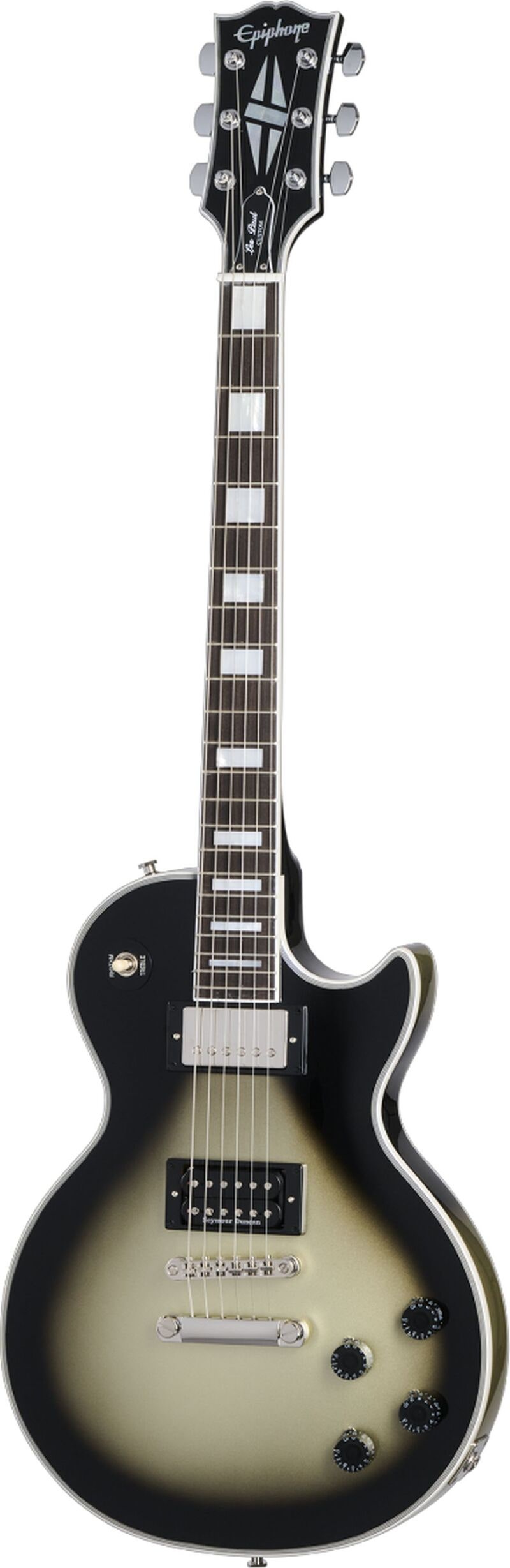 Tuotenumero 1086098Epiphone Adam Jones 1979 Les Paul Custom Antique Silverburst on huippuluokan sähkökitara, jossa yhdistyvät Custombucker- ja Seymour Duncan Distortion -mikrofonit, eebenpuuotelauta ja klassinen Antique Silverburst -viimeistely – täydellinen valinta vaativalle Les Paul -soittajalle.