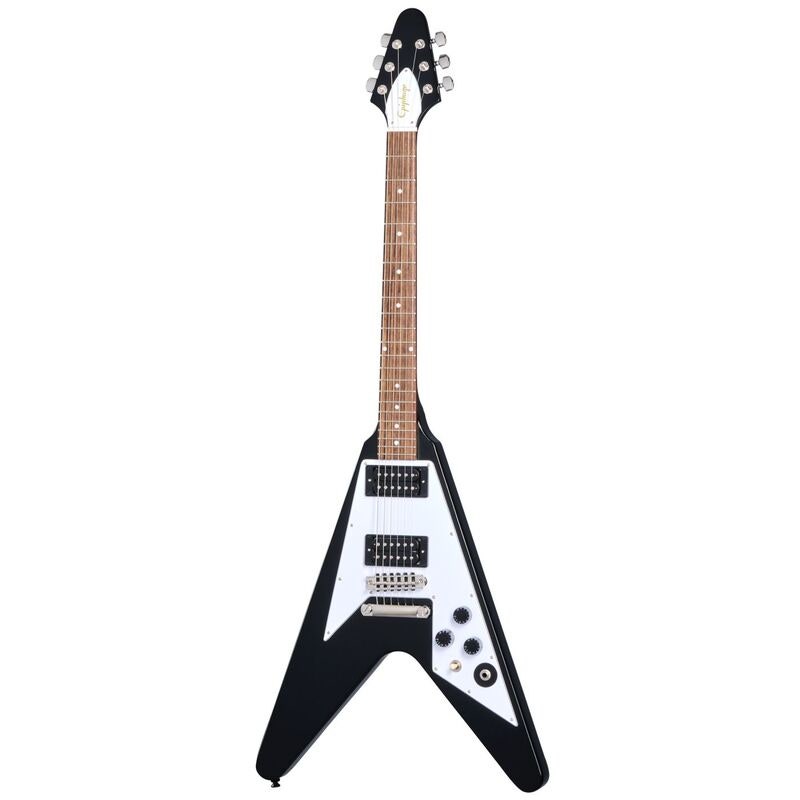 Tuotenumero 1090655Epiphone Kirk Hammett 1979 Flying V Ebony on tarkka uudelleenluonti legendaarisesta metallikitarasta: mahonkirunko ja -kaula voluutilla, Gibson USA Calibrated T-Type -mikrofonit, CTS-elektroniikka, Grover Rotomatic -virittimet ja LockTone Stop Bar – näyttävä sähkökitara rankkaan soittoon.