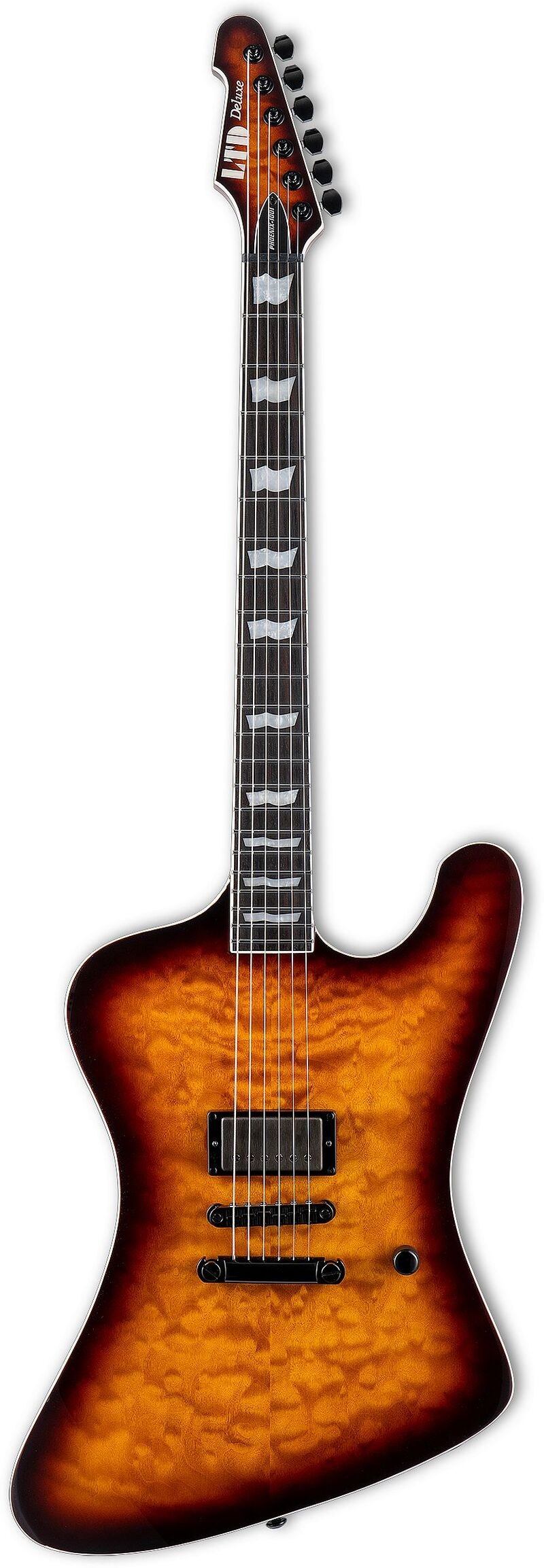 LTD Phoenix-1001 QM Tobacco Sunburst yhdistää Phoenix-runkomuodon virtaviivaisuuden premium-luokan viimeistelyyn ja komponentteihin. Quilt maple -kansi ja Tobacco Sunburst -väri korostavat soitinta visuaalisesti, samalla kun neck-thru -rakenne tarjoaa sustainia ja vakautta niin lavalle kuin studioon.