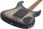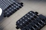 The guitar features a radius top, neck-thru construction with Ultra Access and a roasted maple/purpleheart multi-ply neck reinforced with carbon fiber rods. The ebony fingerboard features offset and reverse Roman numeral inlays along with Luminlay glow-in-the-dark side dots. The Ultra Thin “U” neck profile measures 19 mm at the first fret and 20 mm at the 12th fret. The scale length is 25.5” (648 mm) with a 12”–16” compound radius. The guitar is equipped with 24 X-Jumbo stainless-steel frets and a Graph Tech XL Black Tusq nut.