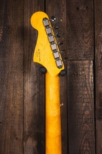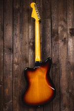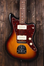 The alder body produces a balanced sound with clear highs and defined lows. Its high-gloss polyester finish in 3-Color Sunburst highlights the wood grain beautifully, while the classic Jazzmaster shape offers comfort and timeless style. The maple neck with a “C”-shaped profile and 9.5” radius ensures smooth playability, whether you’re playing chords, lead lines, or expressive bends. The rosewood fingerboard with 21 medium jumbo frets enhances comfort and intonation across the entire register.