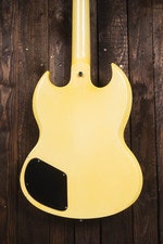 The Gibson SG 1985 features a solid mahogany body with set-in construction. The neck is made from a single piece of mahogany, and the fingerboard is rosewood with 22 frets and dot inlays. The scale length is 24.75 inches (628 mm), and the nut width is 1 11/16 inches (~43 mm).