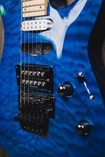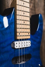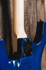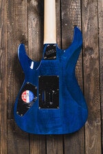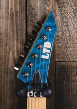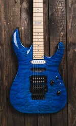 The MH-203QM offers the arched top of the ESP Horizon with the aggressive styling elements of the M Series, all wrapped in an affordable high-quality instrument, and adds a quilted maple top in See Thru Blue finish. It offers the versatile H/S/S (humbucker/single coil/single coil) pickup configuration, making it great for many genres of music. The MH-203QM features bolt-on construction of a mahogany body with a maple neck and maple fingerboard with 24 extra-jumbo frets, and includes an LTD by Floyd Rose tremolo.