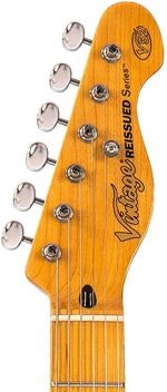 The Vintage V52 is equipped with two Wilkinson Single Coil pickups – WVTN in the neck position and WVTB in the bridge – delivering the full range of vintage Tele tones, from warm rhythm sounds to sharp and defined leads. The Wilkinson WTB bridge features three individually intonated brass saddles for precise tuning and enhanced sustain. Wilkinson WJ55S locking tuners ensure stable tuning performance.