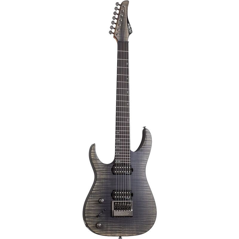 The configuration includes two Lundgren M7 humbuckers. Controls consist of volume, tone with push-pull functionality and a three-way pickup selector. The instrument is equipped with Schecter Locking tuners and an Evertune F7 bridge.