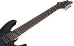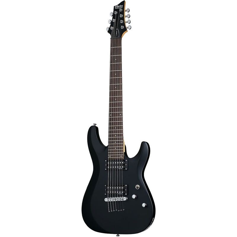 The Schecter C-7 Deluxe Satin Black is a seven-string electric guitar with a basswood body, bolt-on maple neck and rosewood fingerboard. It features 24 X-Jumbo frets, a Tune-O-Matic bridge with string-through-body construction and dual Schecter Diamond Plus humbuckers.