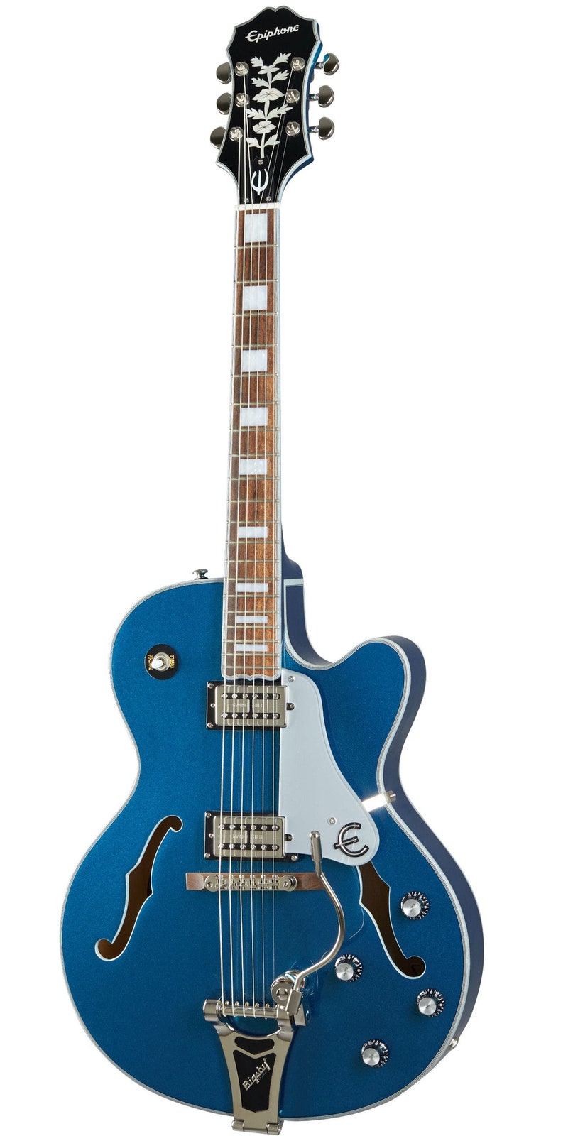Tuotenumero 1070134Epiphone Emperor Swingster Delta Blue Metallic on hollowbody sähkökitara Bigsby-vibralla, SwingBucker-mikrofoneilla ja laajalla soundivalikoimalla – täydellinen valinta jazzista rockabillyyn.