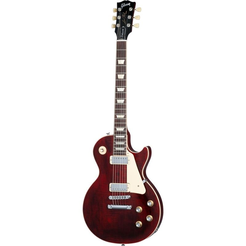 The Les Paul Deluxe 70s Classic features a solid mahogany body without weight relief and a maple top. The construction provides balanced tone with clear mids and defined attack.