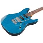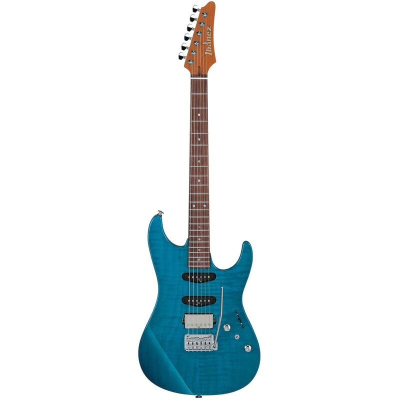 The body consists of African mahogany with a flamed maple top, finished in Transparent Aqua Blue.