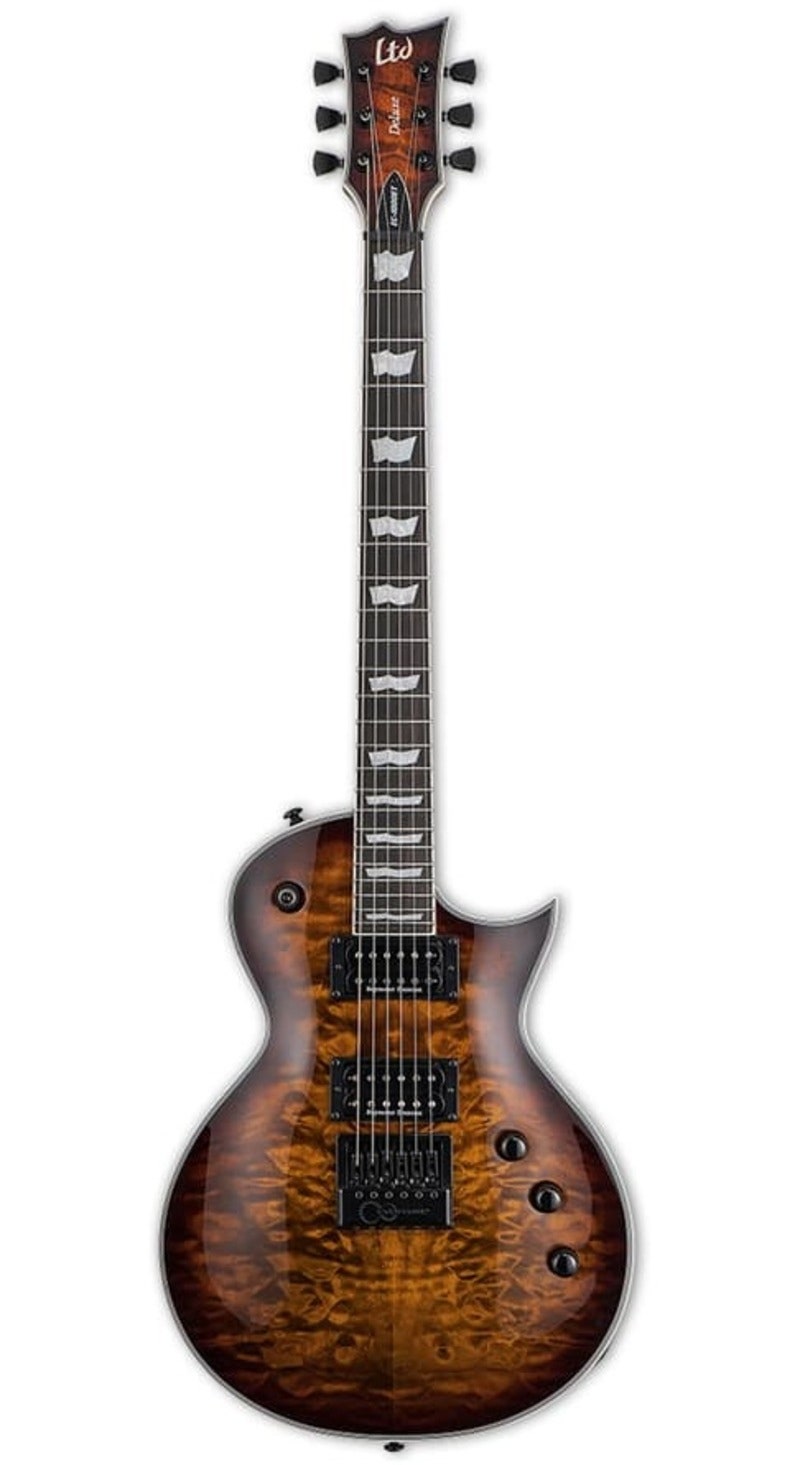 Tuotenumero 1074274LTD EC-1000 Evertune Dark Brown Sunburst on huippuluokan sähkökitara, jossa on Evertune-talla, quilted maple -kansi, Seymour Duncan JB/Jazz -mikrofonit ja set-thru -rakenne.