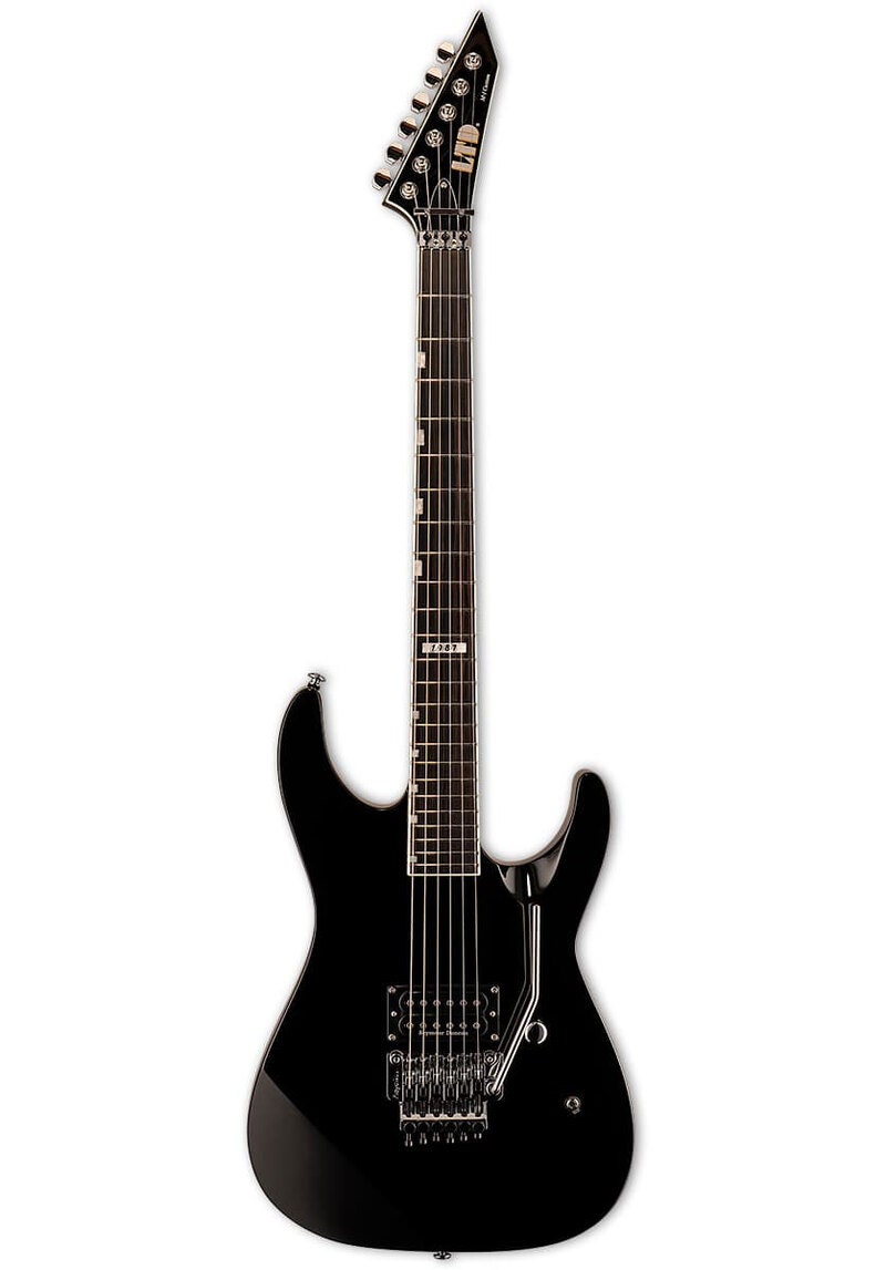 Tuotenumero 1074270LTD M-1 Custom ’87 Black on shred-tyylinen sähkökitara, jossa on neck-thru -rakenne, Seymour Duncan Distortion TB-6 -tallamikrofoni coil split -toiminnolla, EMG PA-2 -boost ja Floyd Rose 1000 -tremolo nopeaan ja aggressiiviseen high-gain -soittoon.