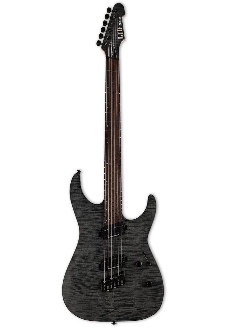 LTD M-1000 Multi-Scale See Thru Black Satin tuo moniskaalatekniikan moderniin soittoon ergonomian ja jännityksen optimoinnin näkökulmasta. 26.5''–25.5'' skaalapituudet parantavat matalien kielten jännitettä ja korkeiden kielten soitettavuutta, ja vinosti asetellut moniskaalanauhat tukevat luonnollista ranteen asentoa erityisesti teknisissä juoksutuksissa. Flamed maple -kansi ja See Thru Black Satin -viimeistely tuovat soittoon näyttävän visuaalisen ilmeen.