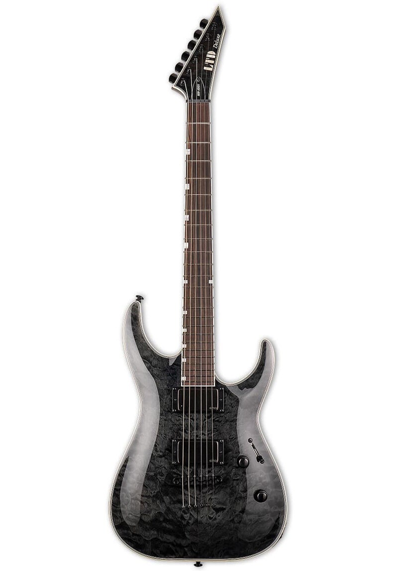 LTD MH-1001NT See Thru Black on LTD 1000 -sarjan sähkökitara soittajalle, joka haluaa yhdistää luotettavan kiinteätallan, laadukkaat aktiivimikit ja näyttävän ulkonäön. Mahonkirunko quilted maple -kannella ja läpikuultava See Thru Black -viimeistely tuovat esiin puun kauniin syykuvion ja antavat soittimelle modernin, lavalle valmiin ilmeen.