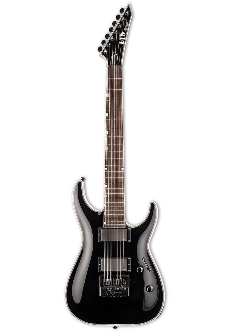 Tuotenumero 1074558LTD MH-1007 EverTune Black on 7-kielinen sähkökitara, jossa yhdistyvät EverTune-talla, EMG 85-7H/81-7H -aktiivimikit ja mahonkirunko vaahterakannella moderniin metalliin ja mataliin vireisiin.