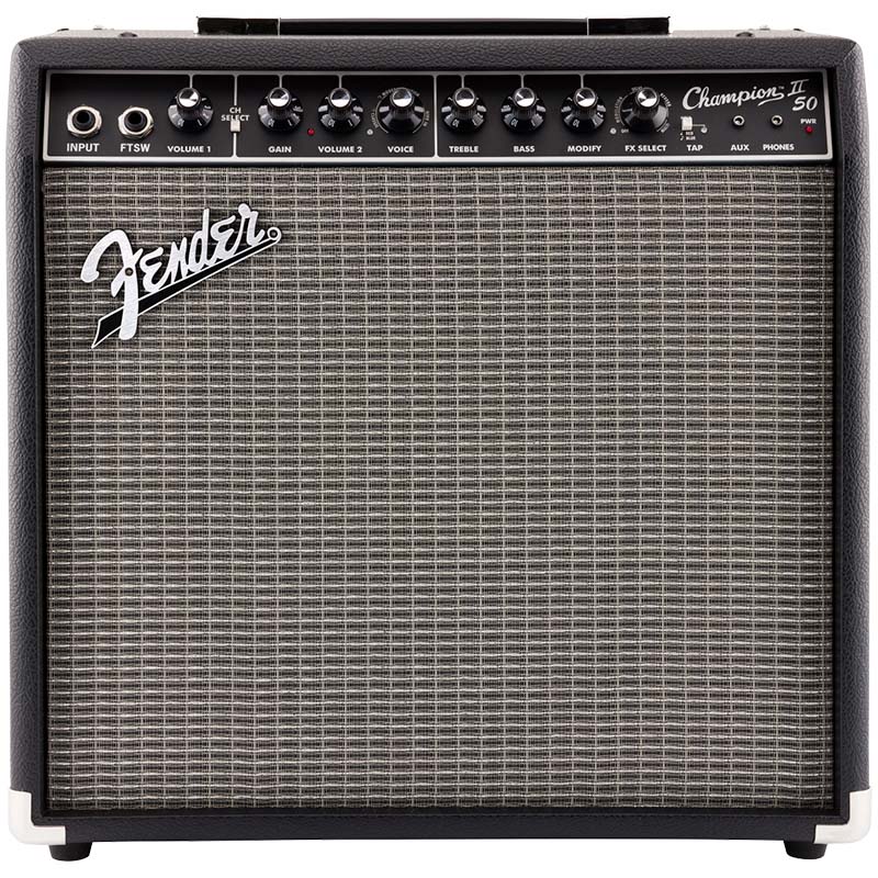 Tuotenumero 1087003Fender Champion II 50 on 50 W kitaravahvistin, jossa on 12” Fender Special Design -kaiutin, kaksi kanavaa ja monipuoliset efektit harjoitteluun ja keikkakäyttöön.