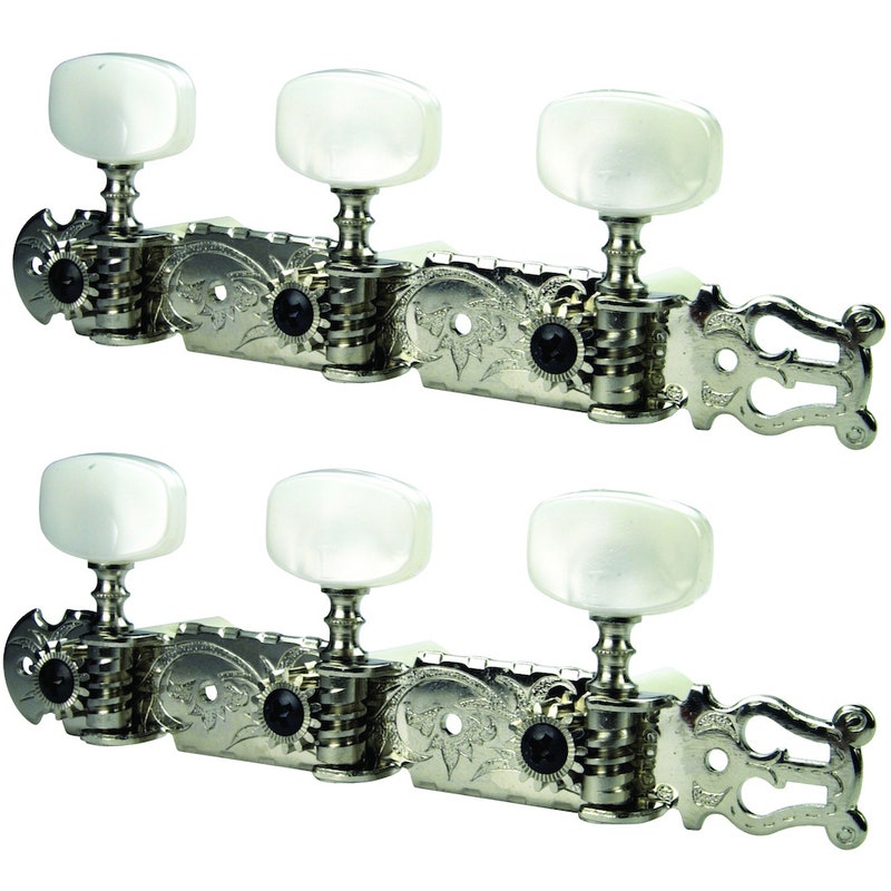 Tuotenumero 1066535Tuner for nylonstringed classical guitar. Nickel, white pearloid buttons.